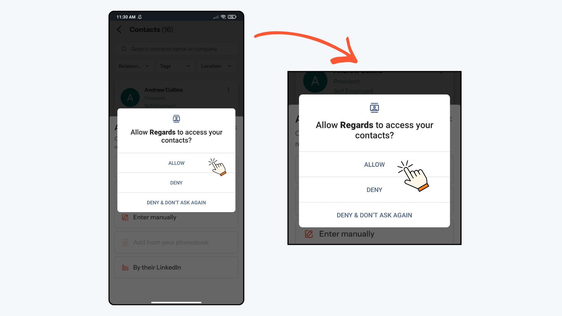 - For Contacts, click Allow to import your existing phone book into Regards AI.