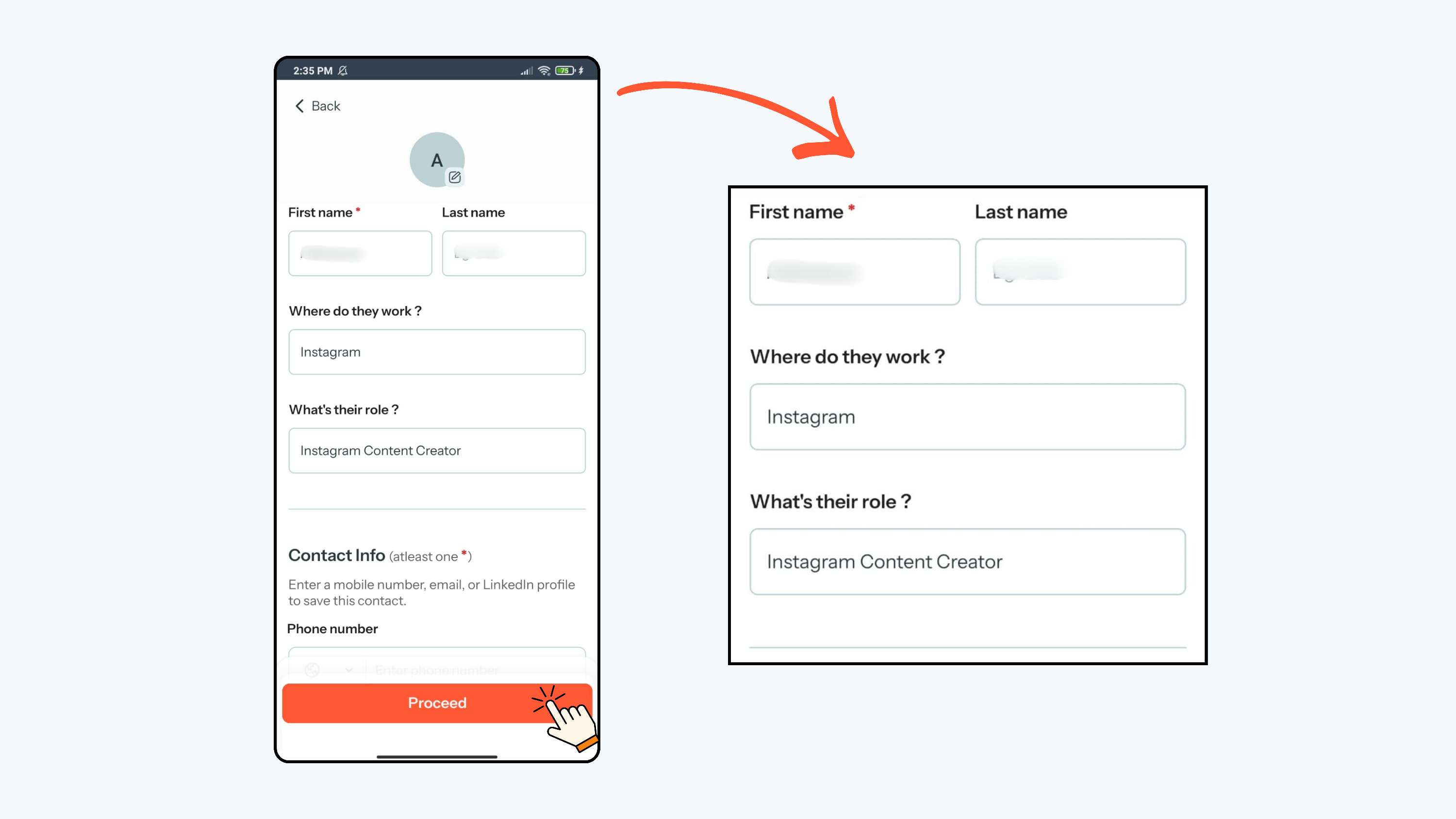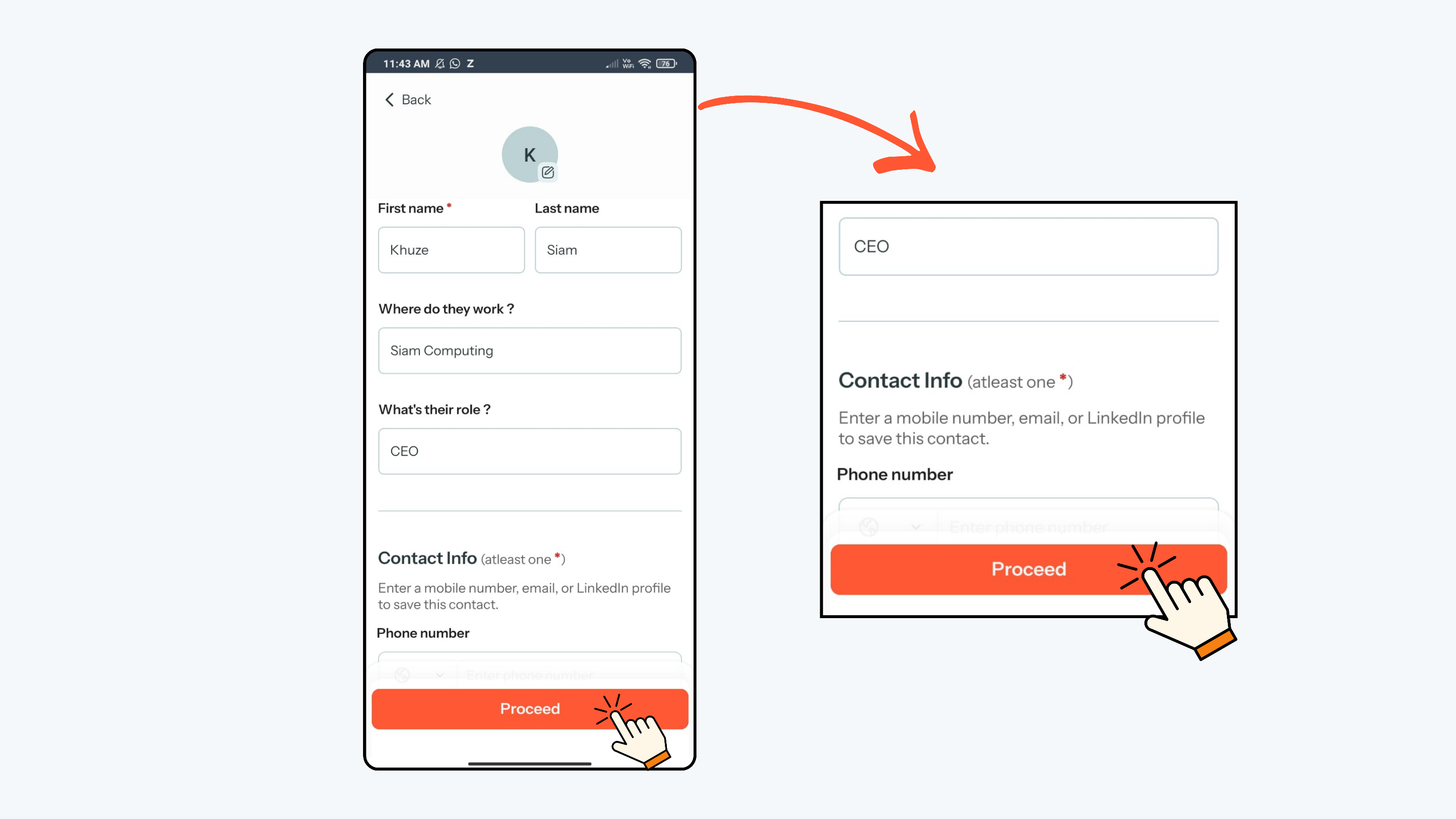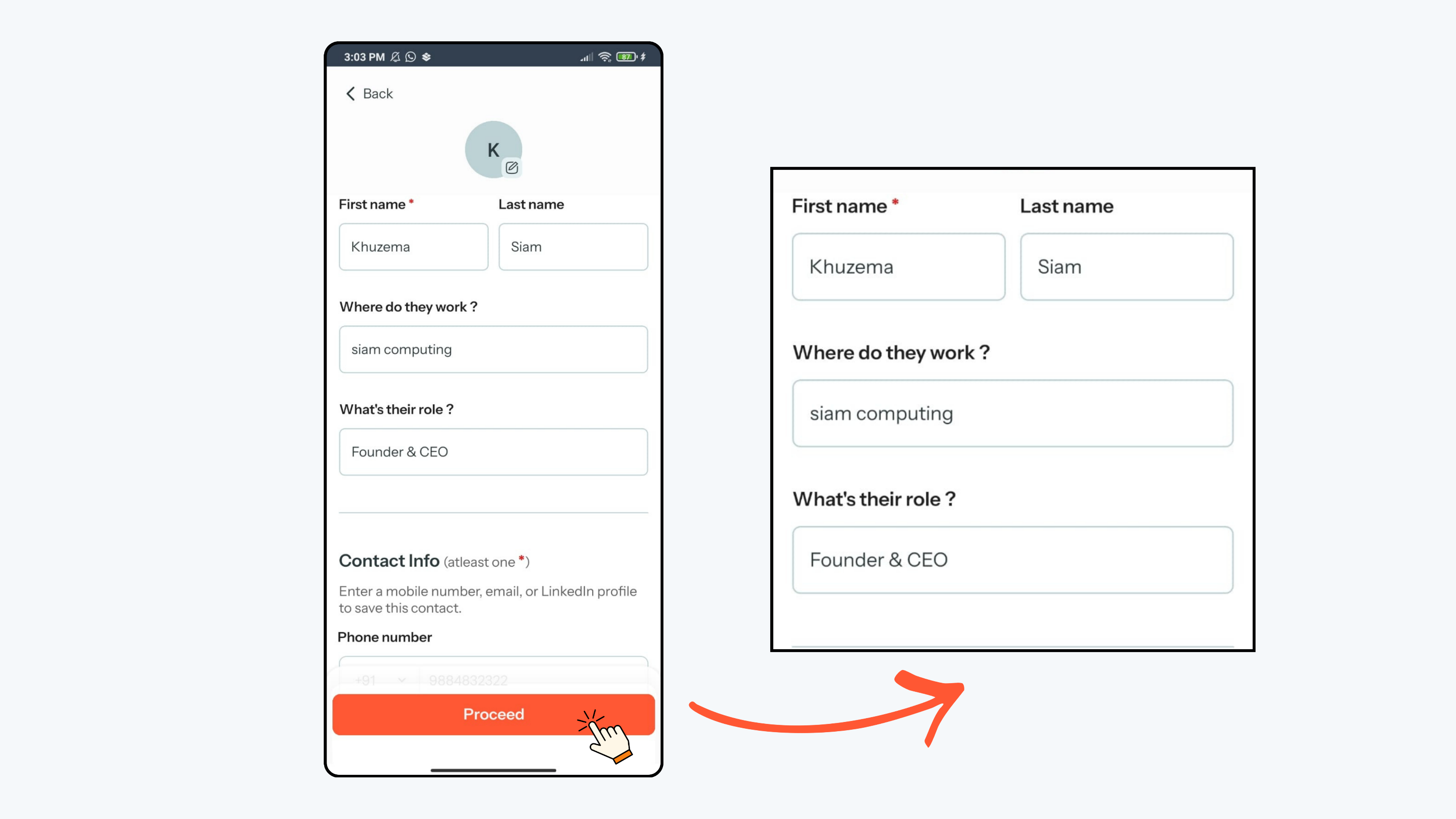 - Carefully review all the extracted details on the screen, and if everything is correct, click Proceed to create the contact; if any information is incorrect, edit the details and then click Proceed.