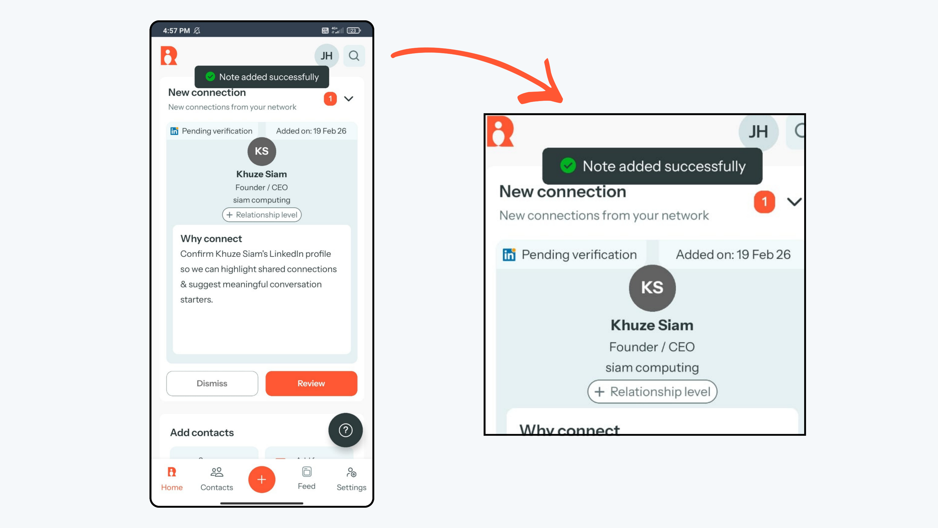 - Your note will be added successfully to the contact.