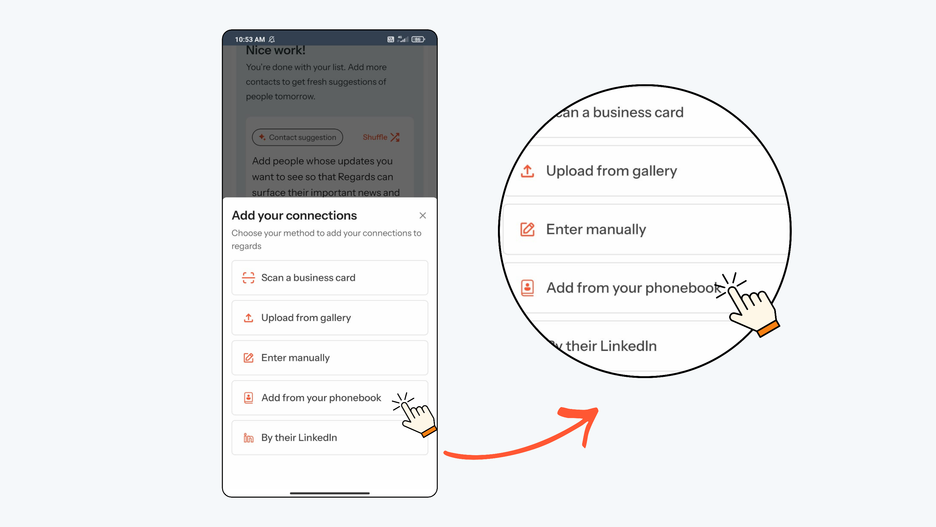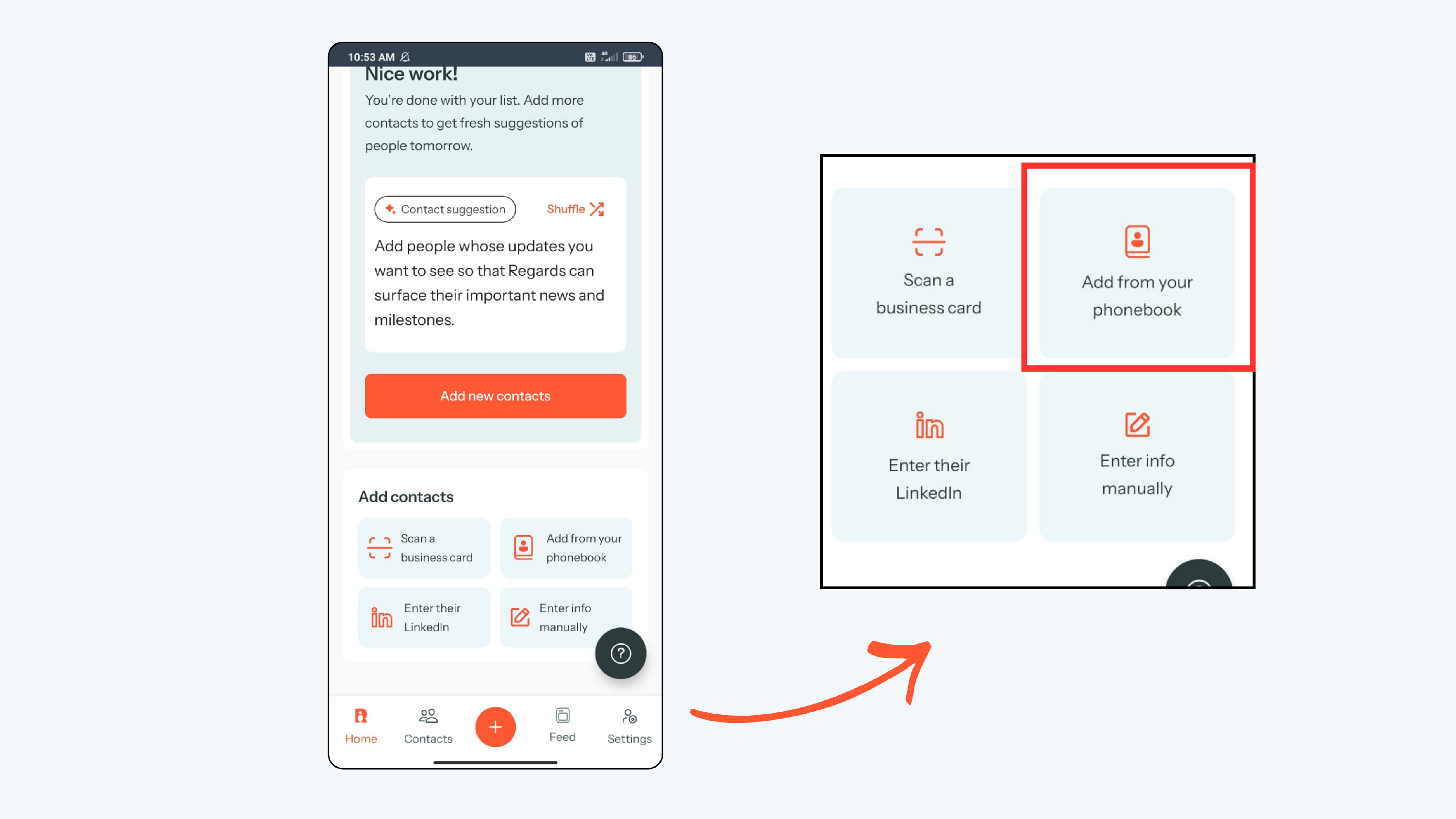 When you select Add from Phone book, you will be asked to grant access to your phone contacts. Once the access is granted, you can then choose and upload only the contacts you want into Regards AI.