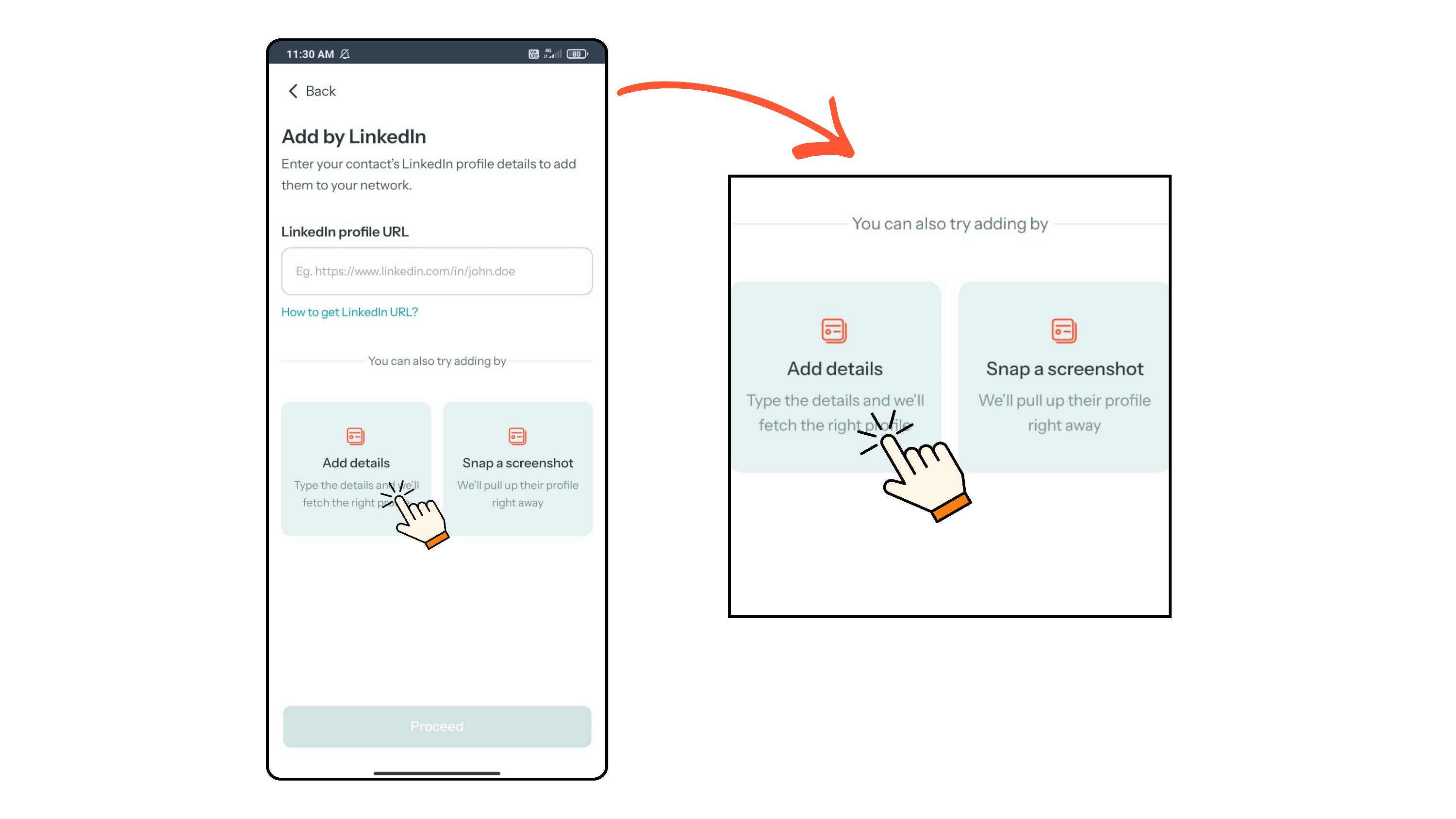 - From the Home Screen, click the “+” button and select By their LinkedIn. Click on Add details.