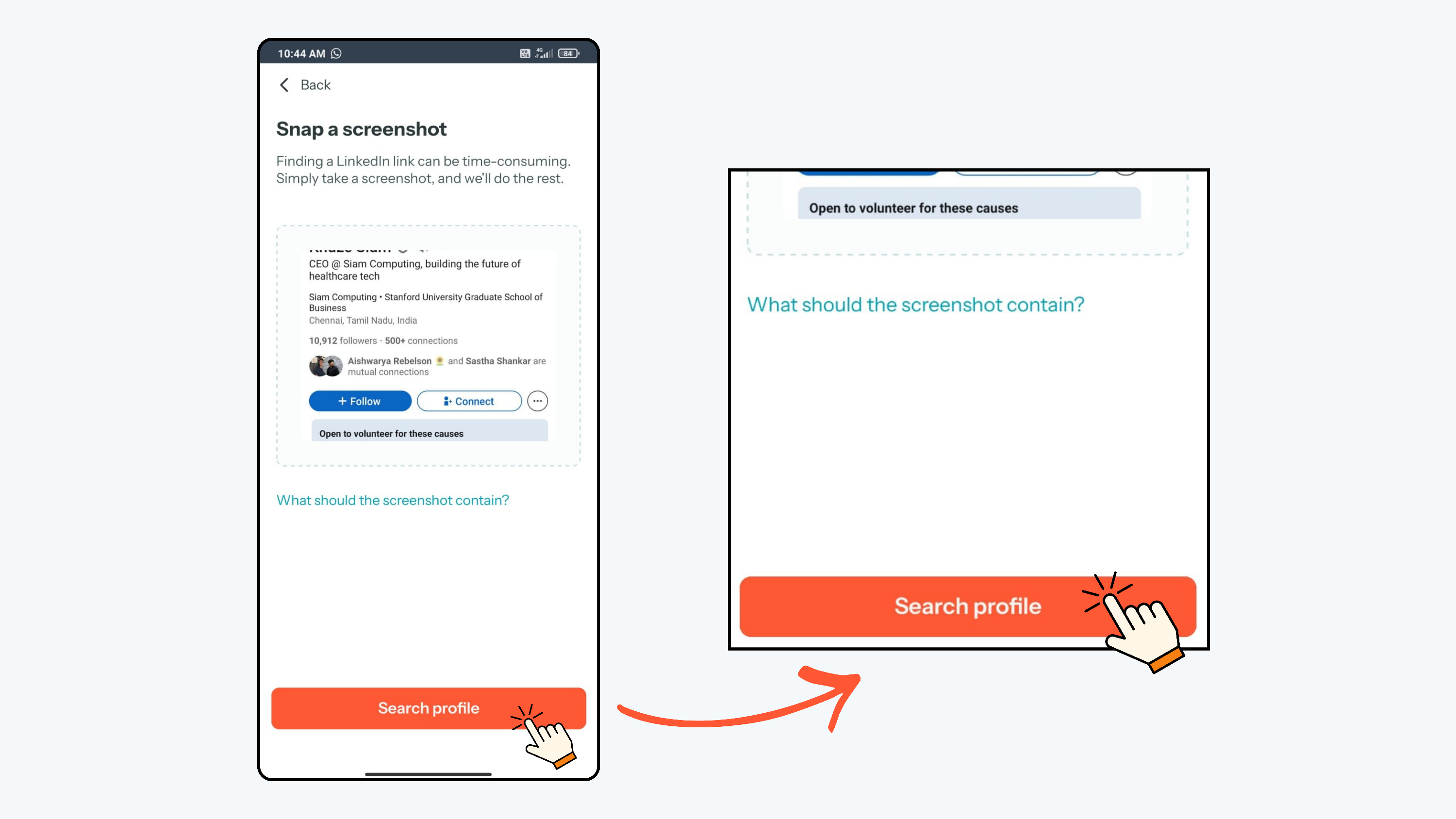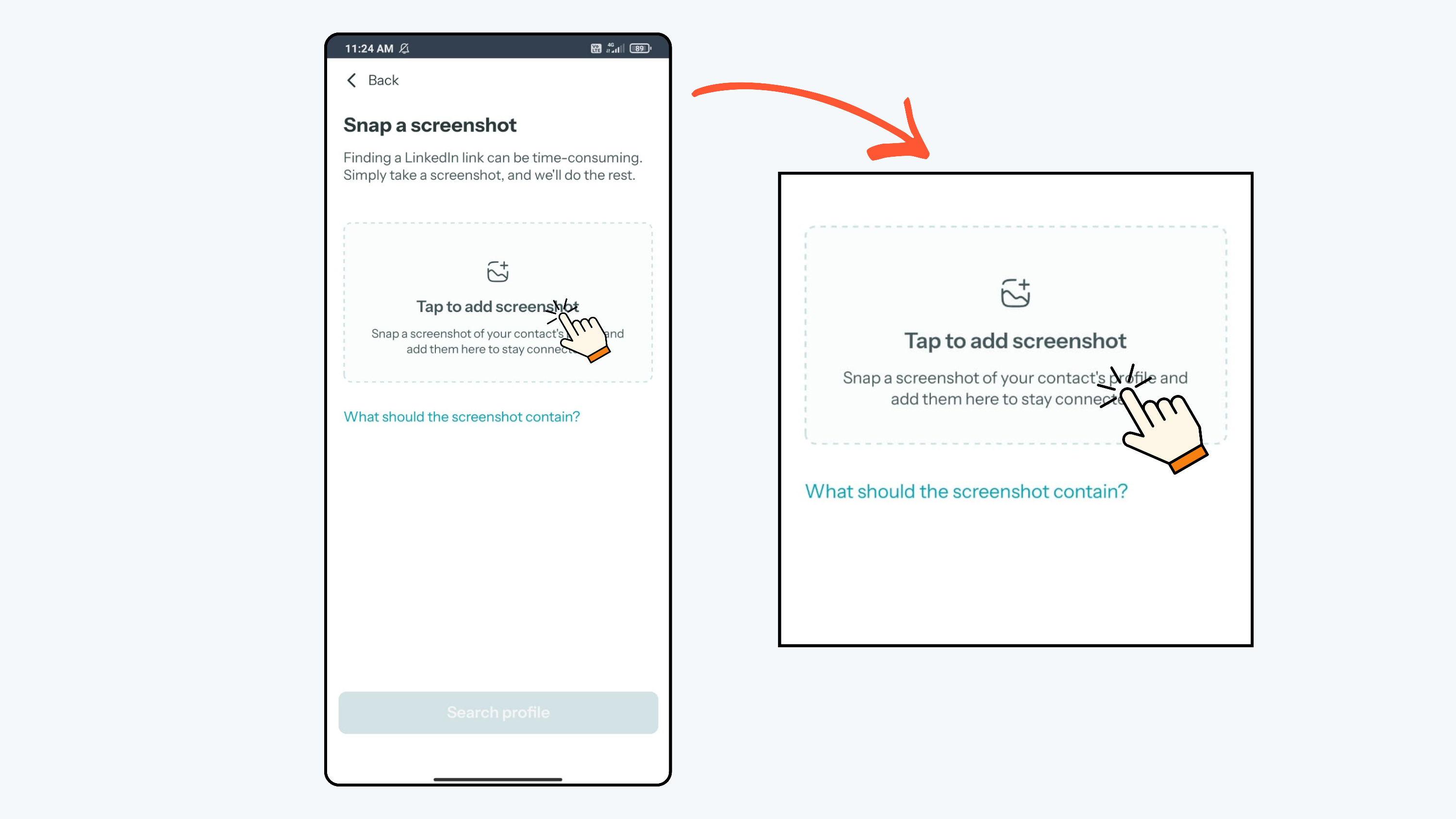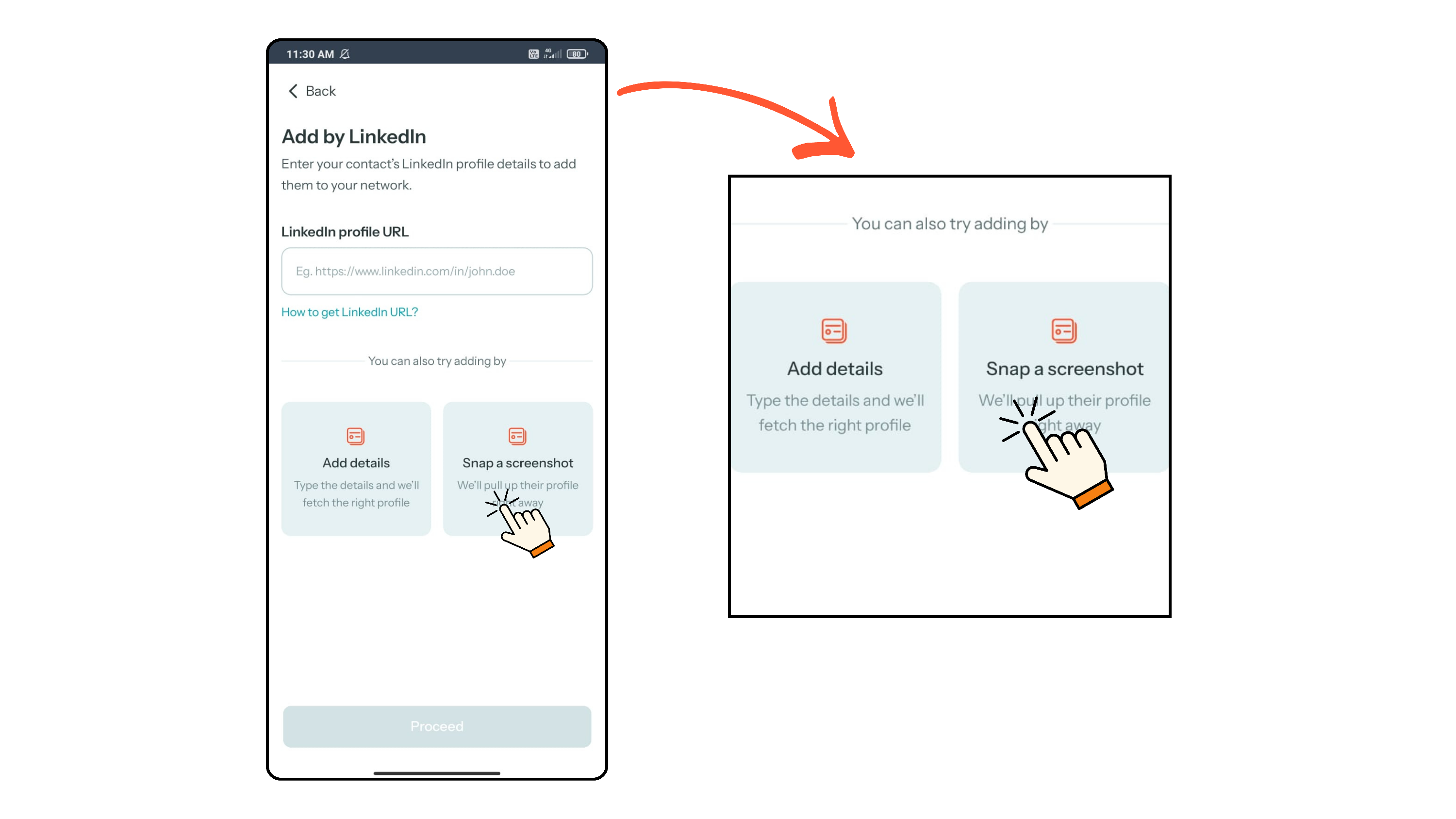 - From the Home Screen, click the “+” button and select By their LinkedIn. Click Snap a screenshot located at the bottom-right corner.