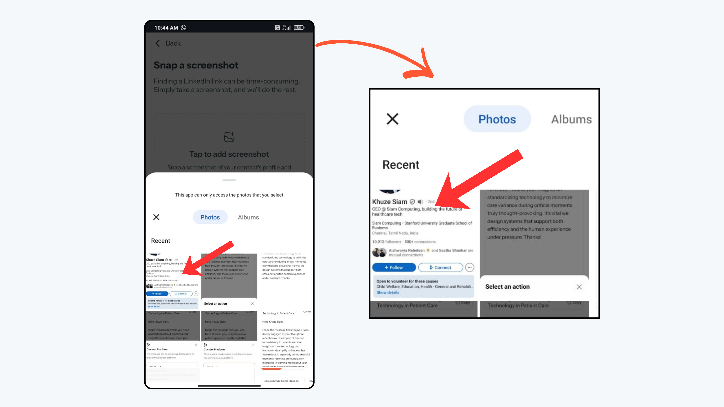 - Before starting this process, take a full screenshot of the person’s LinkedIn profile clearly showing their profile picture, name, company, and role.