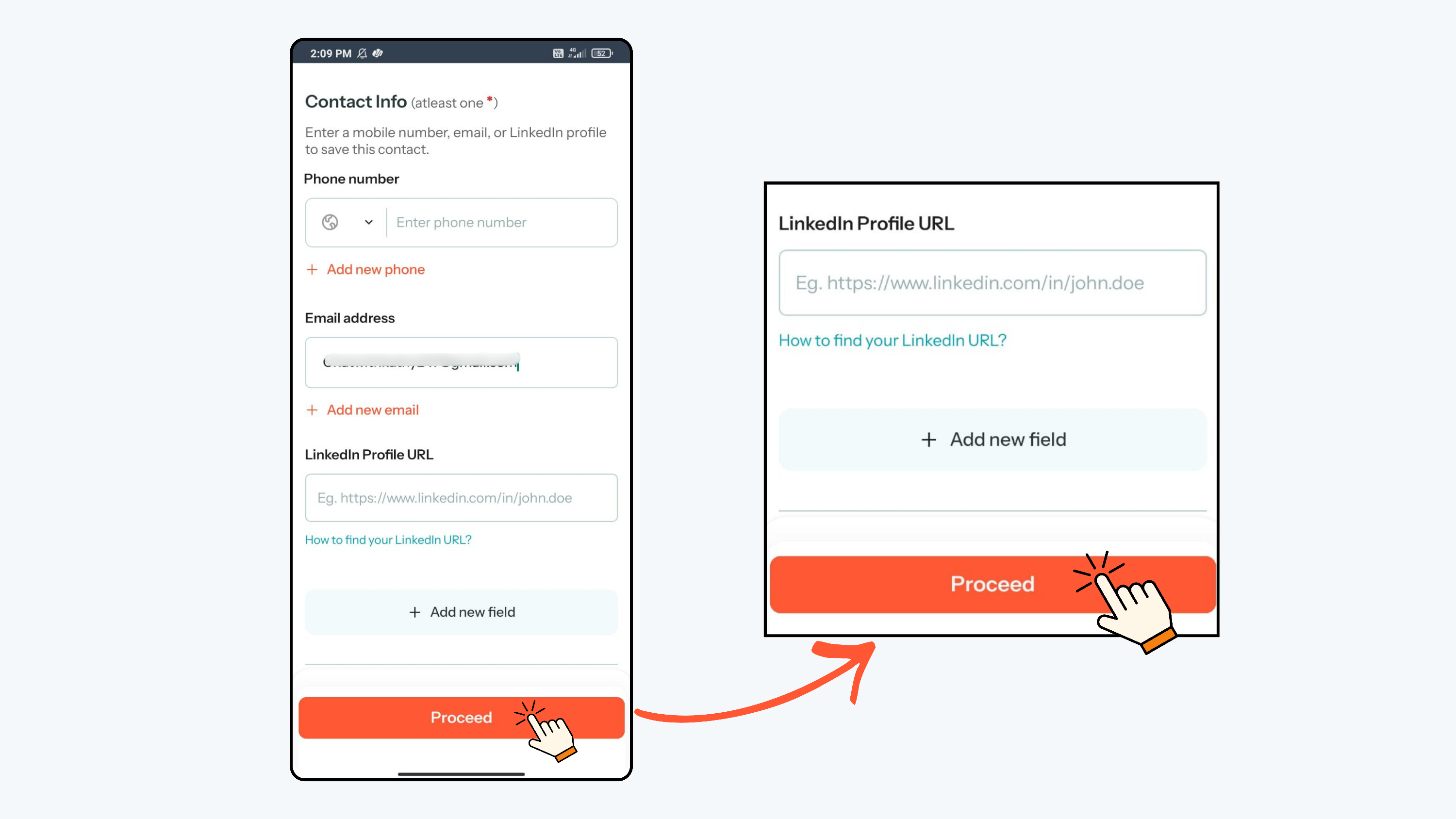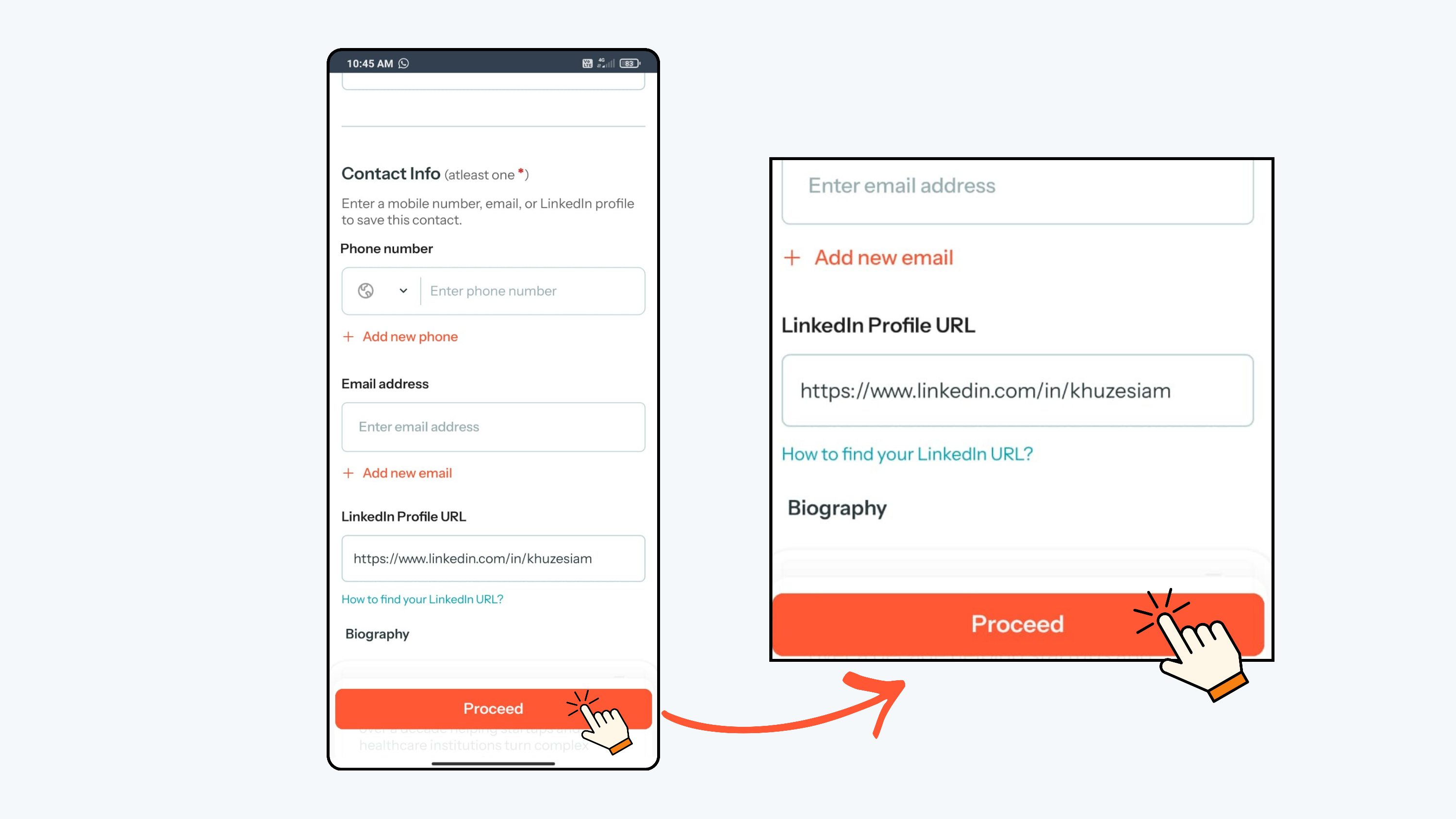 - Make sure you at least add one contact detail such as phone number, email, or LinkedIn URL (if available)