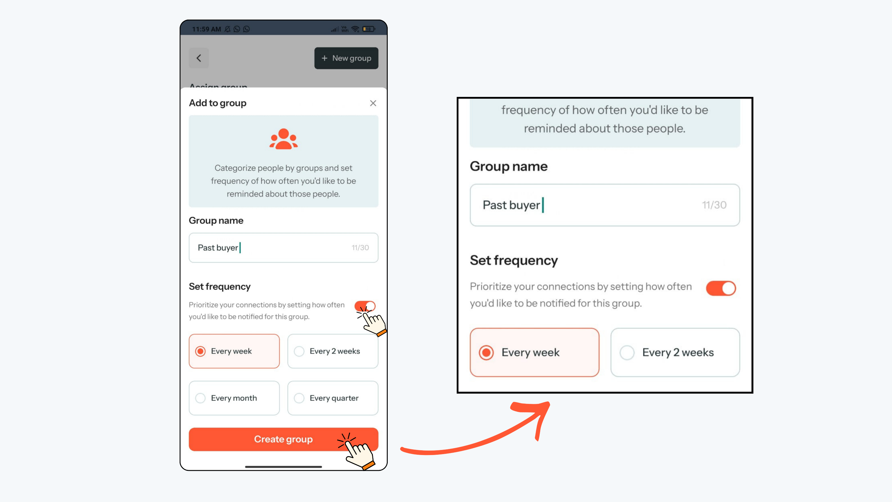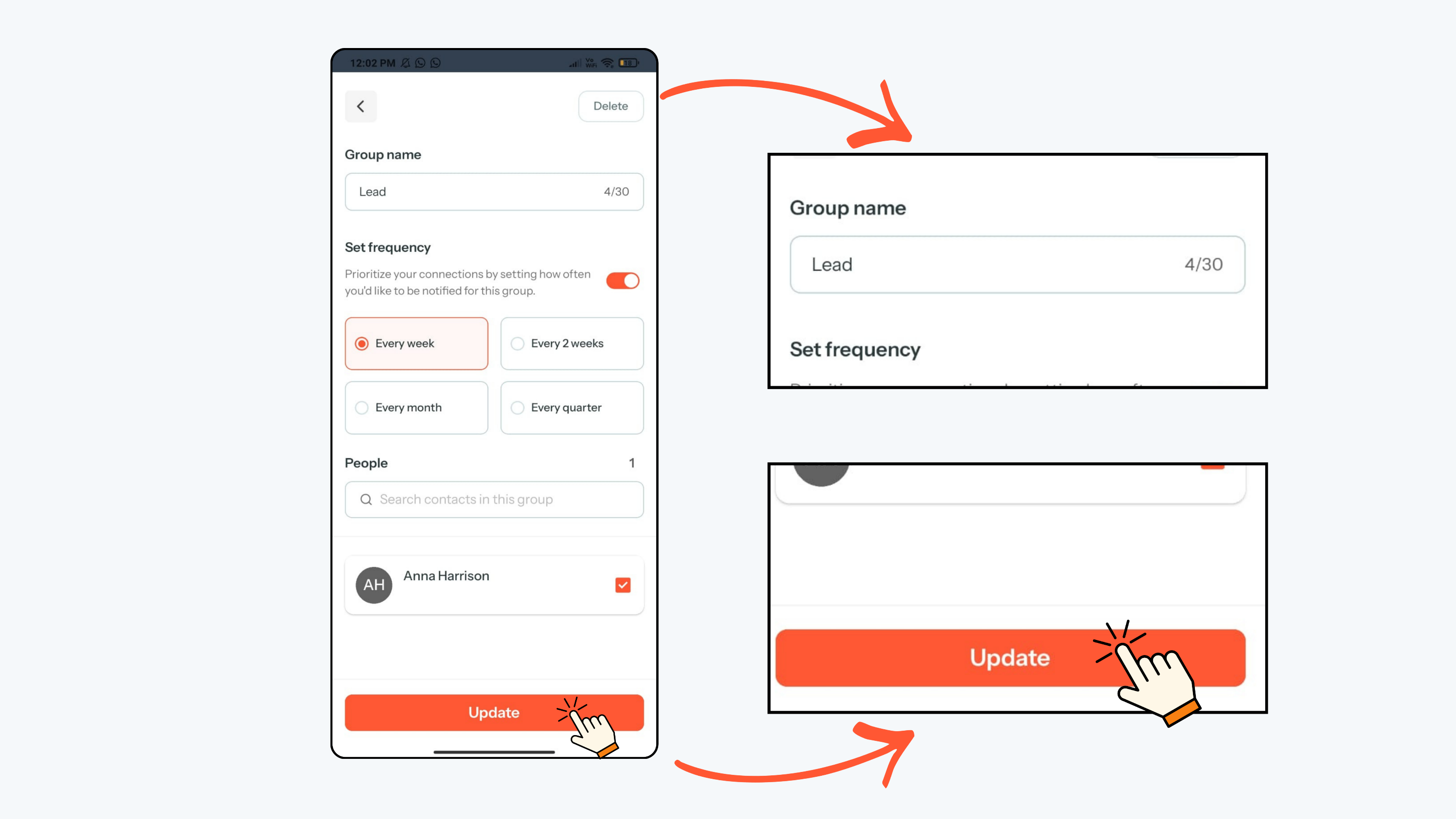 - Next, turn on the Frequency toggle to decide how often you would like to stay in touch with this person.