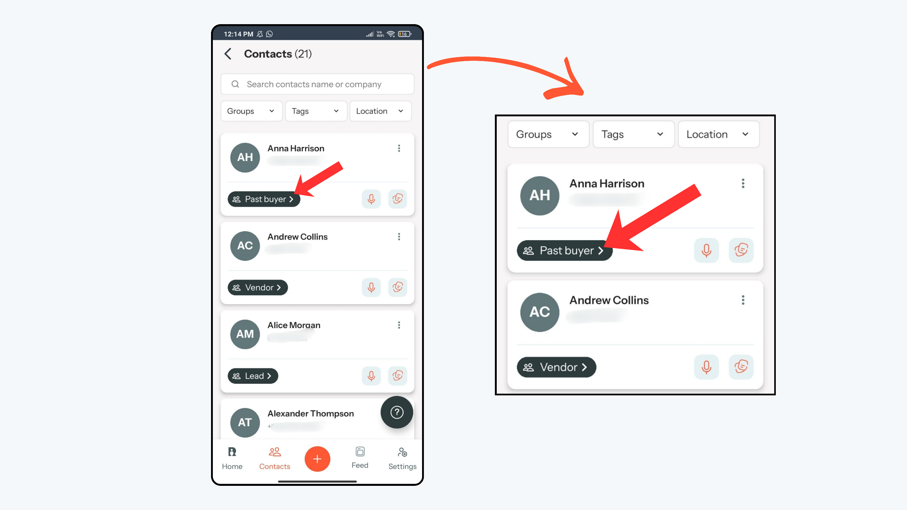 - After saving, the group name will appear on the contact’s card and will automatically update your priority reminders.
