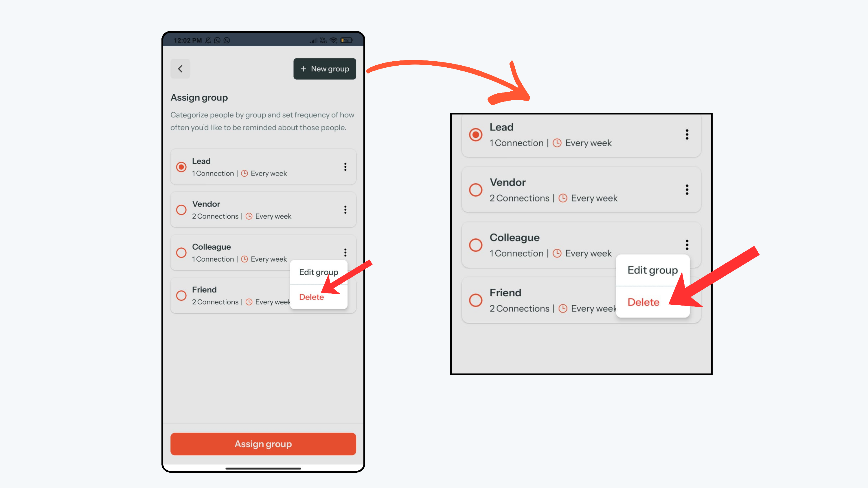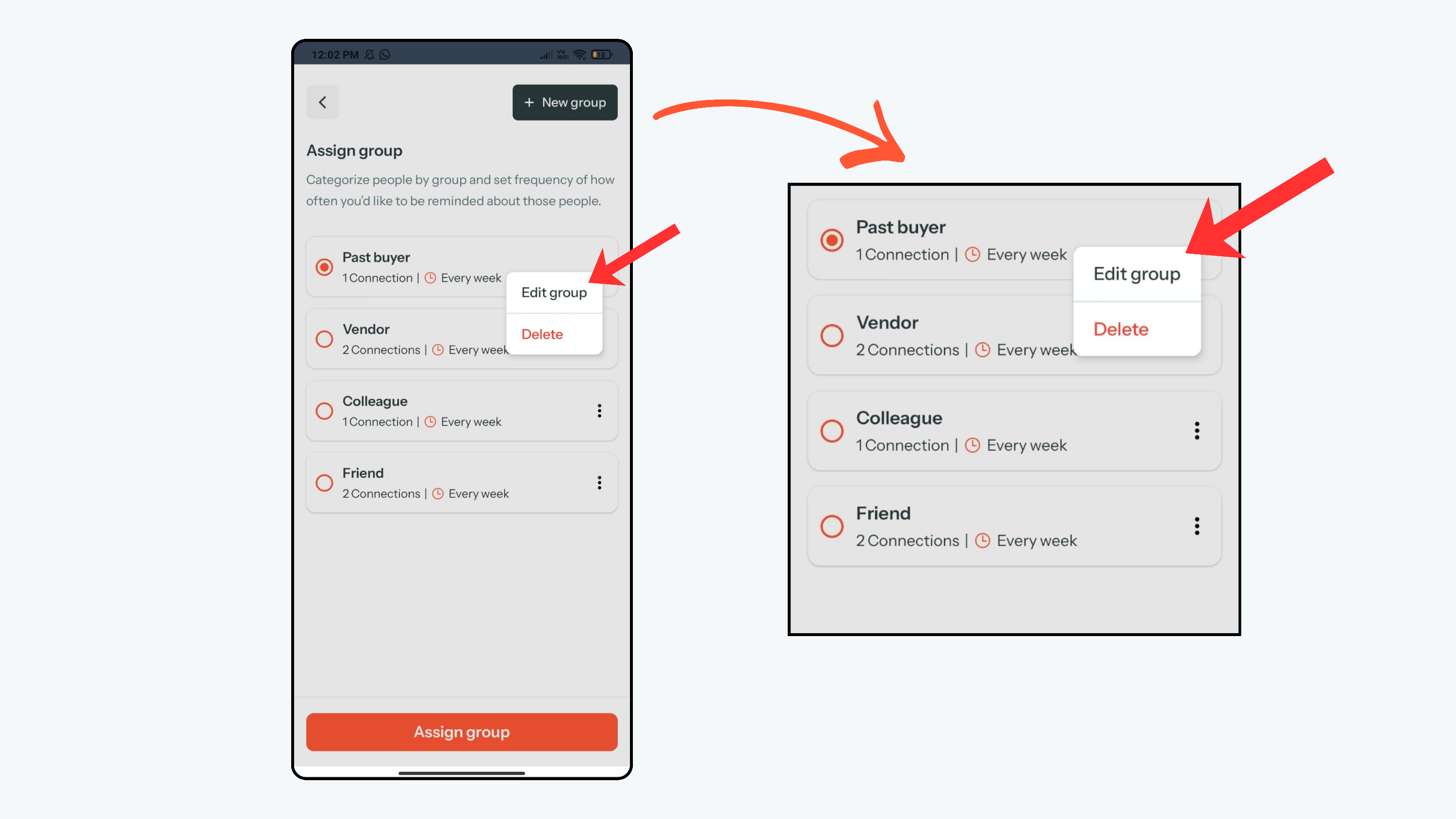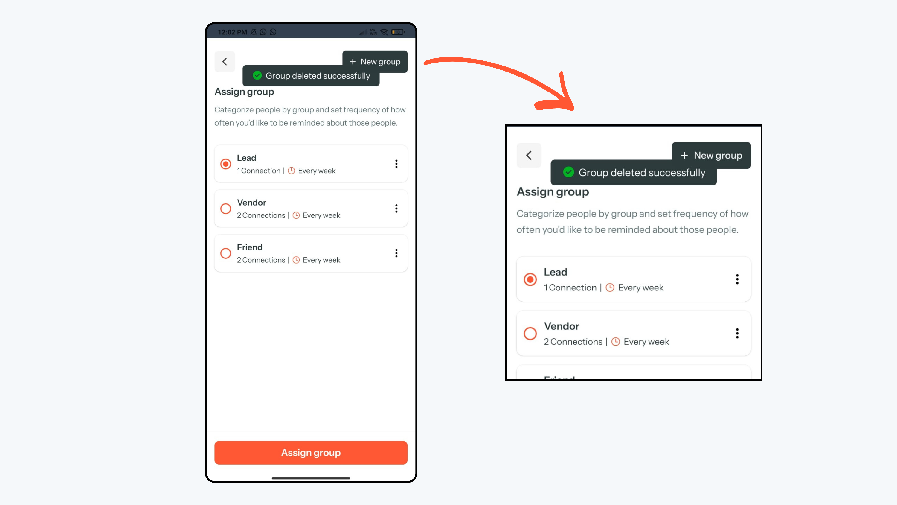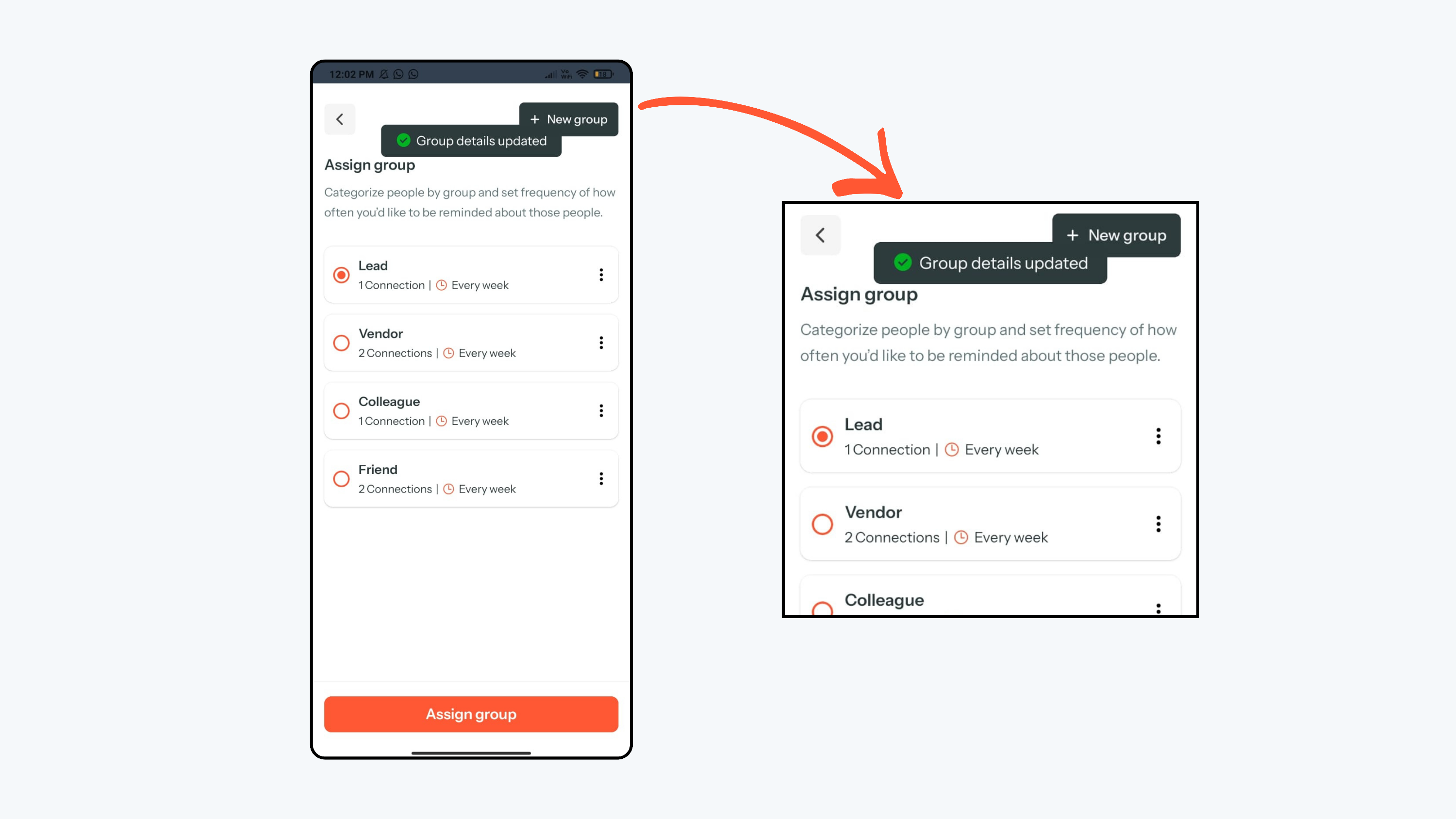 - Then click Assign group to apply the updated group to the contact.