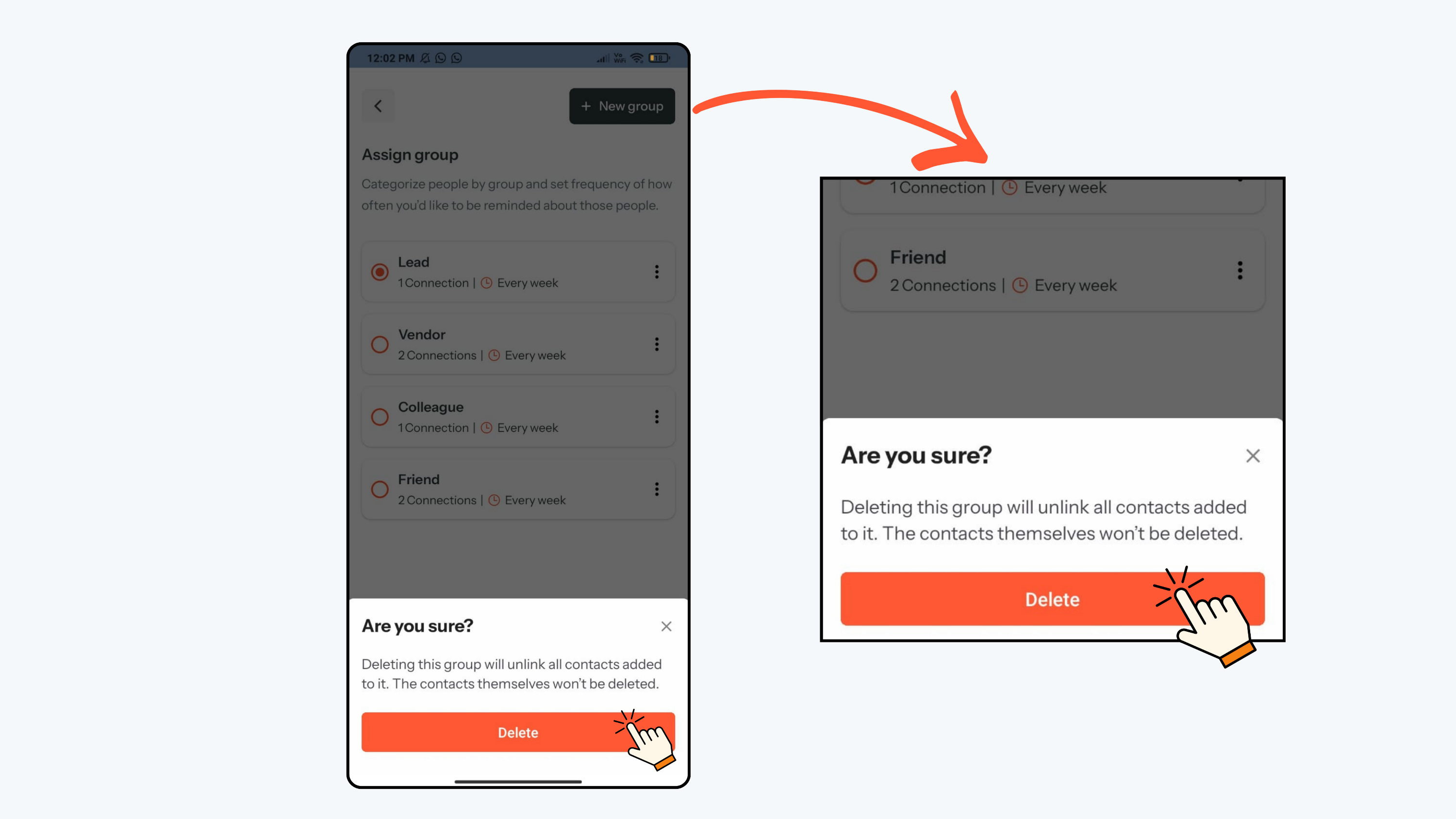 - The group has now been successfully deleted. Once deleted, the group will no longer appear on the contact’s profile or in your suggestions.