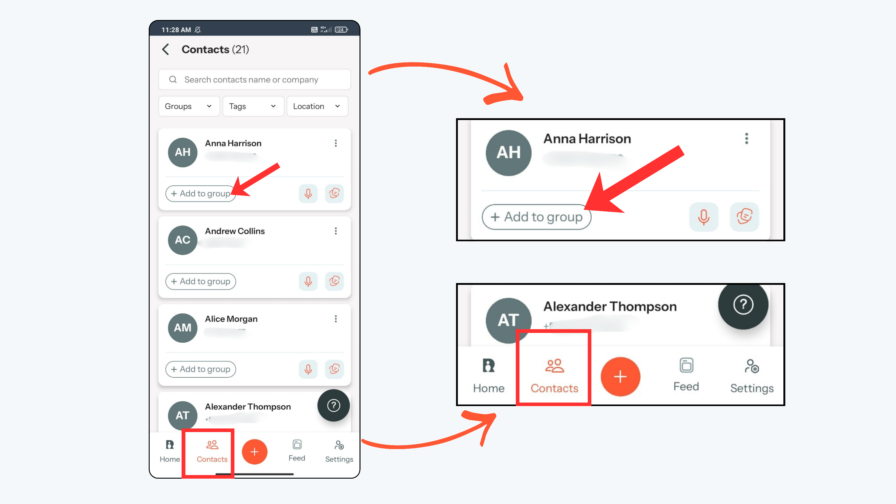 - To add a contact to a group, go to the Contacts page and open the contact card.