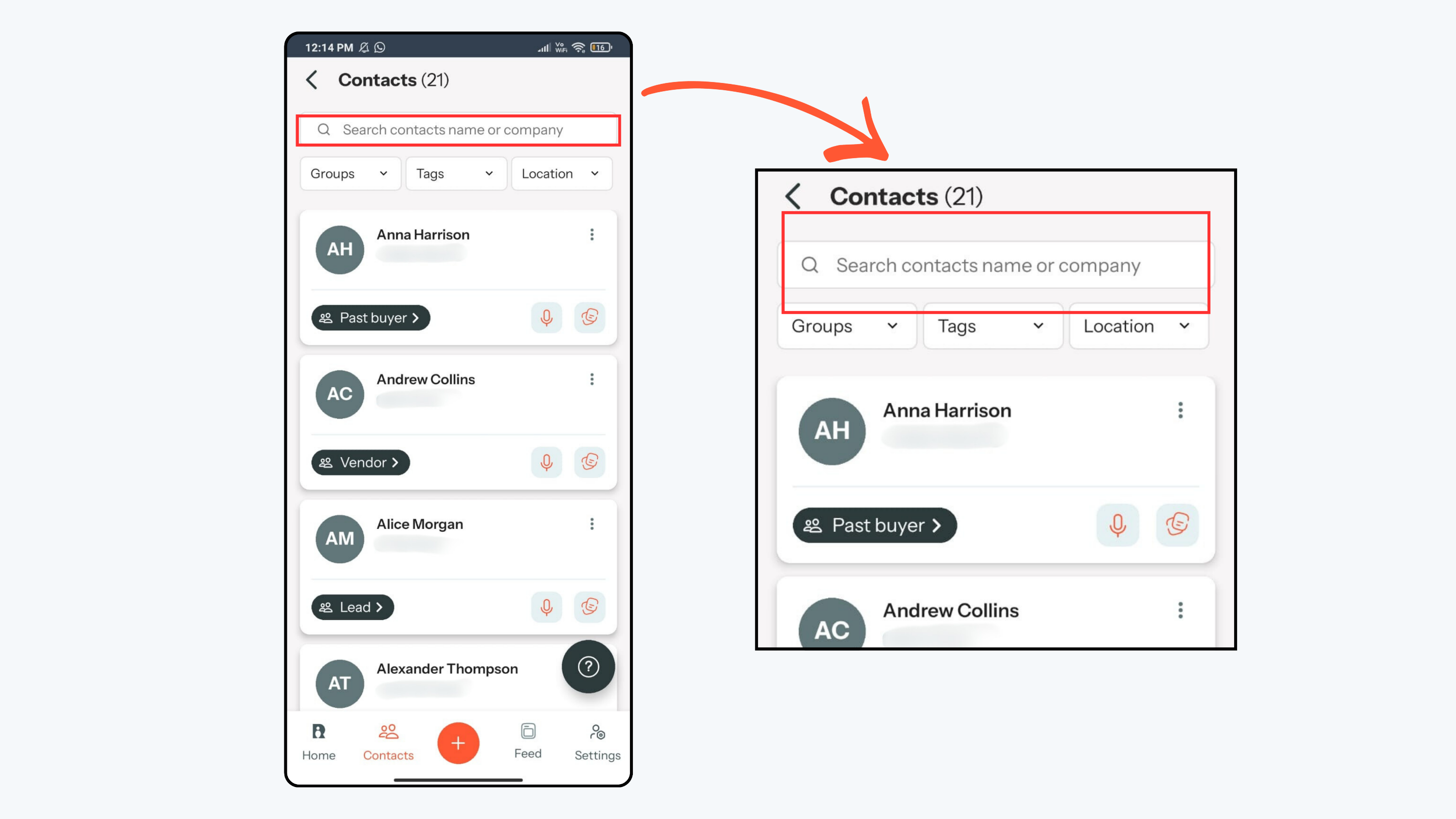 - The Search bar on the contacts page allows you to look up people using the details stored on their profile.