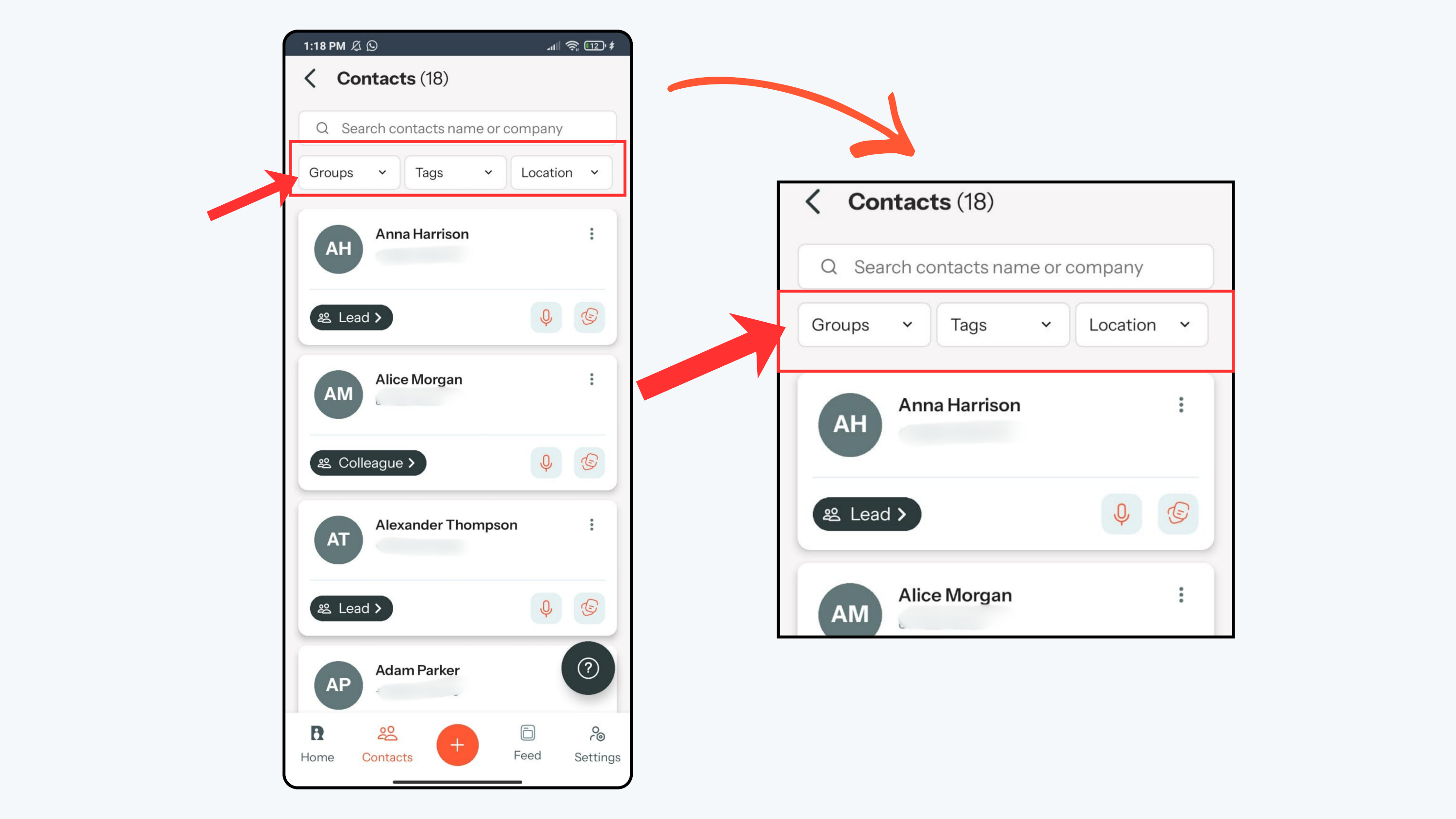 - If you prefer to browse your contacts using categories, you can use the filter options available below the Search bar.