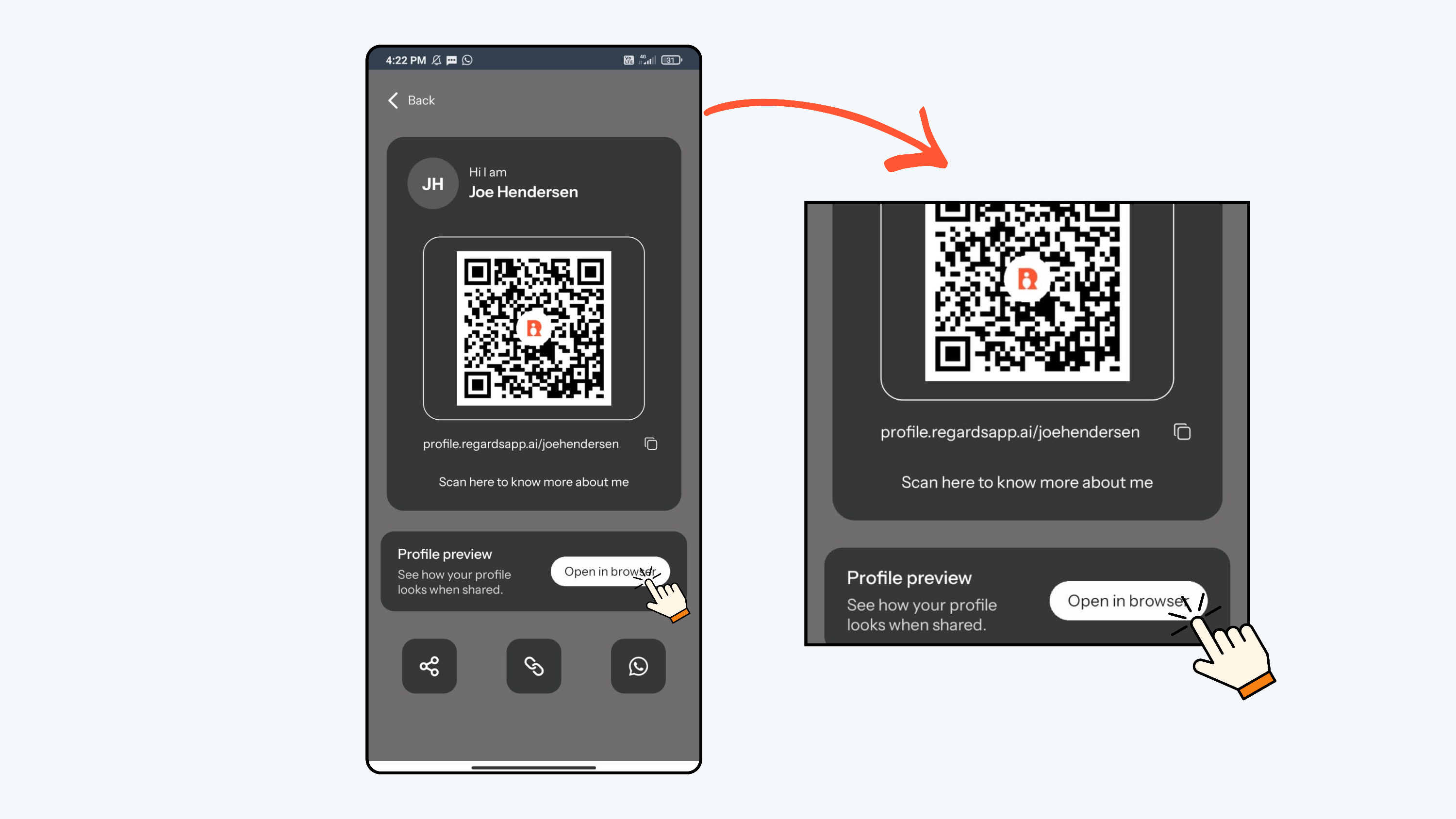 - The Share icon allows you to share your digital profile link with others.