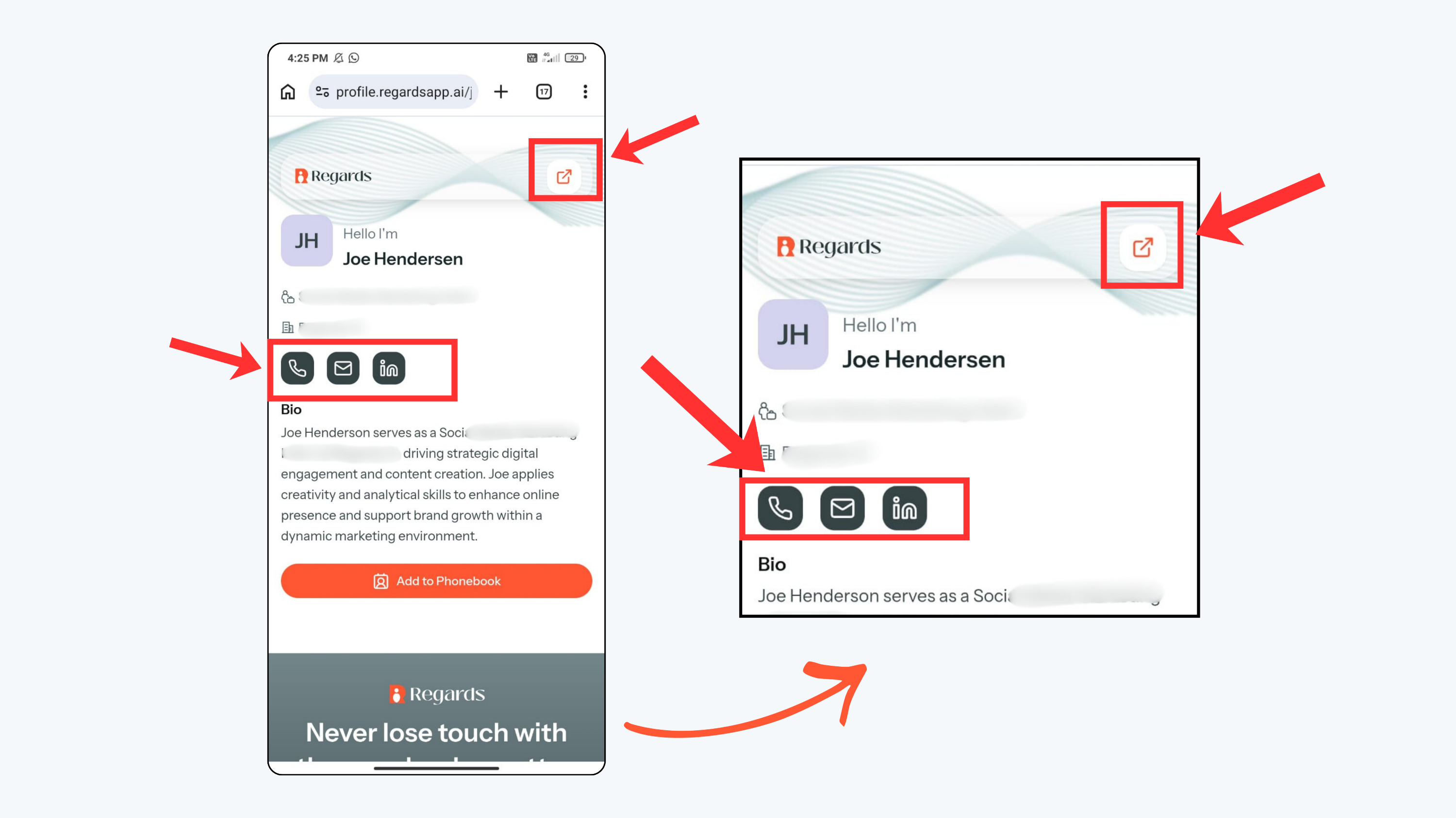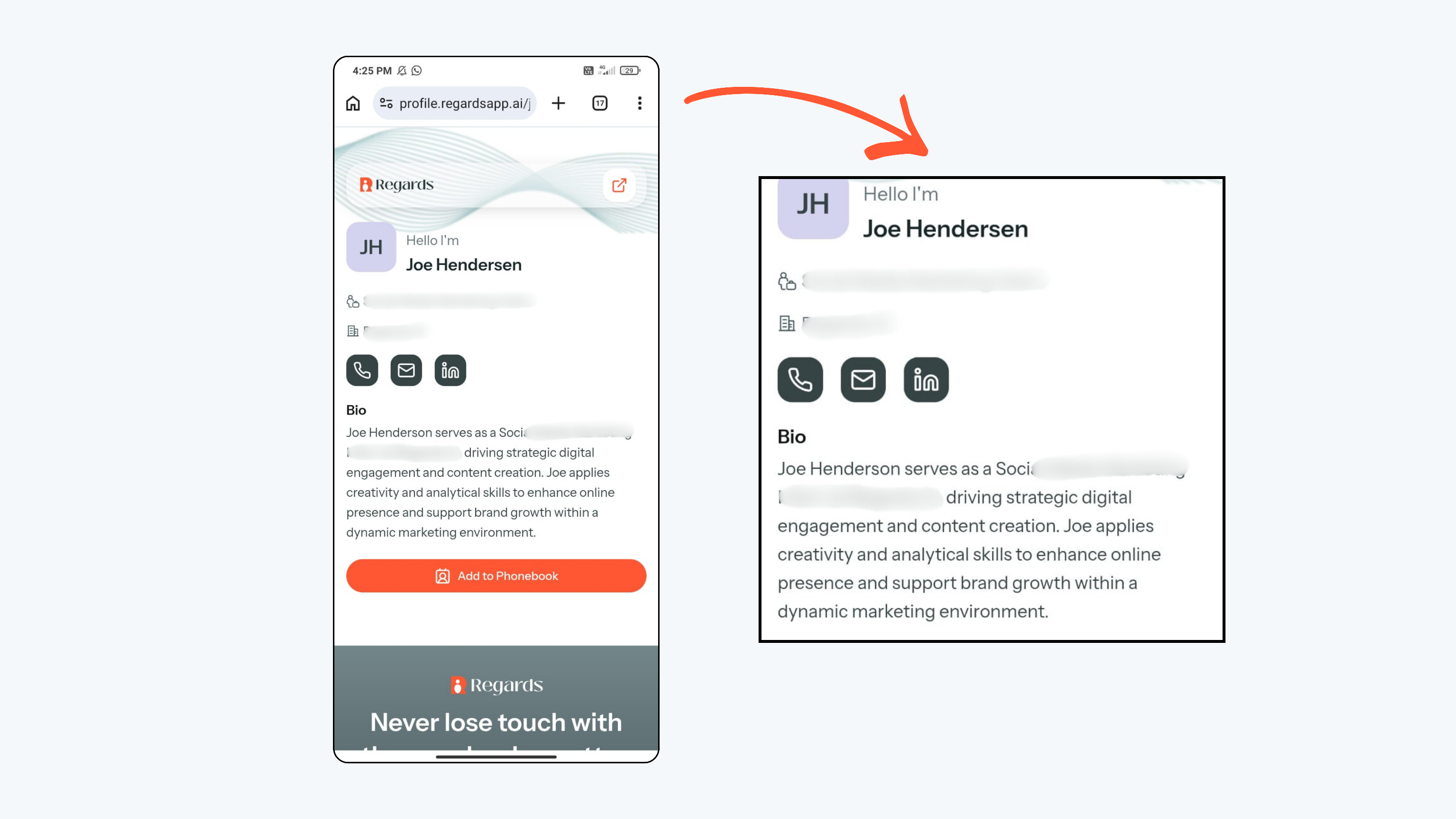 Regards AI automatically creates a digital card and personal profile page for you. This page works like your online visiting card and can be shared with anyone.